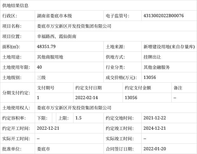 掛牌出讓供地結(jié)果信息(婁底市萬寶新區(qū)開發(fā)投資集團(tuán)有限公司-幸福路西、霞仙街南)